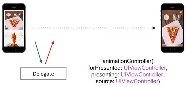 UIKit调用animationController(forPresented:presents:source :)来查看它是否返回一个UIViewControllerAnimatedTransitioning对象。 如果该方法返回nil,则UIKit使用内置转换。 如果UIKit接收到UIViewControllerAnimatedTransitioning对象,则UIKit将该对象用作转换的动画控制器。