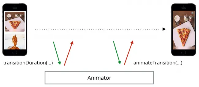 UIKit首先要求您的动画控制器 - 简称为animator - 以秒为单位转换持续时间(transition duration),然后调用animateTransition(using:)。这是您的自定义动画成为焦点的时候。