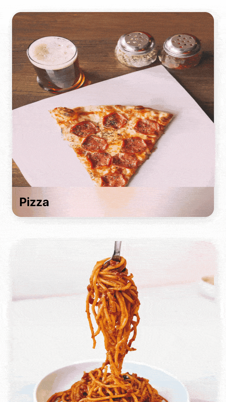 在animations表达式中,您可以更改recipeView的变换,位置和角半径。在呈现时,您将从配方图像的小尺寸变为全屏,因此目标变换只是identity变换。在消失时,您可以对其进行动画处理以缩小以匹配原始图像大小。