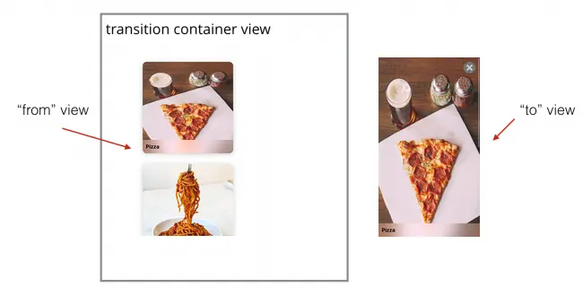 containerView是您的动画所在的位置,而toView是要呈现的新视图。 如果您正在演示,recipeView只是toView,否则您从上下文中获取它,因为它现在是“from”视图。 对于呈现和消失,您将始终为recipeView制作动画。 当您显示详细信息控制器视图时,它将逐渐占用整个屏幕。 当被消失时,它将缩小到图像的原始frame。