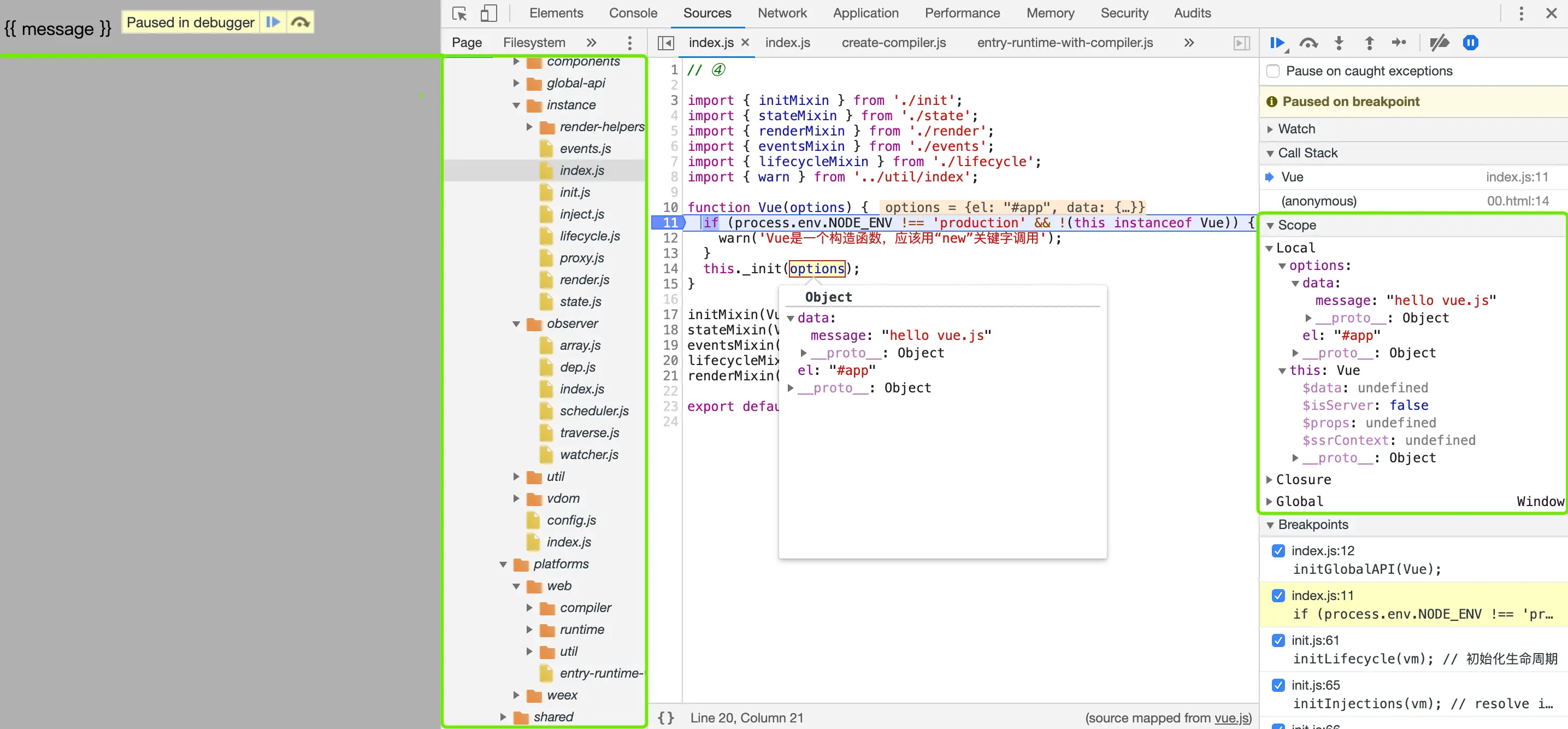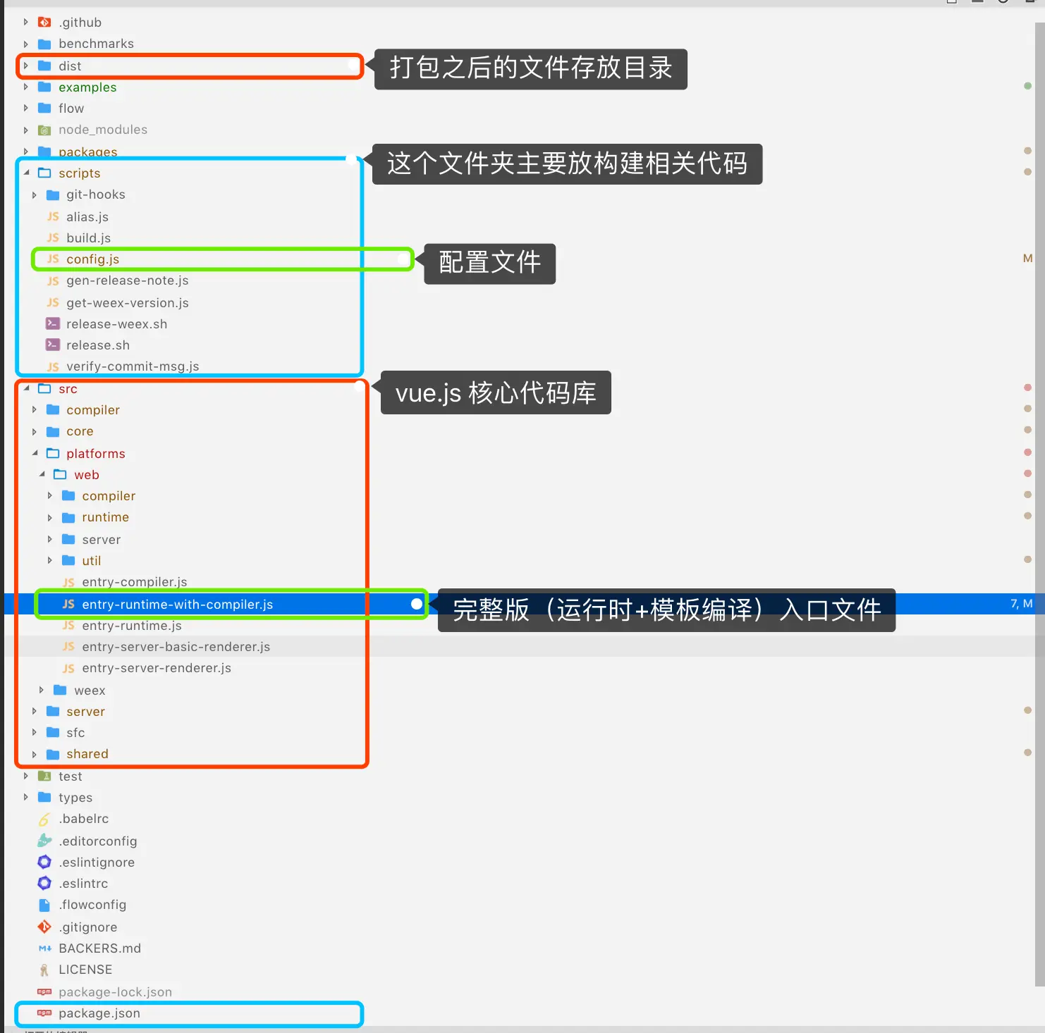 package.json "dev"映射知道了web-full-dev再由配置文件找到入口文件:entry: resolve('web/entry-runtime-with-compiler.js')"web"别名配置 -alias.js查看实际映射为web: resolve('src/platforms/web')- 最终锁定了入口文件: