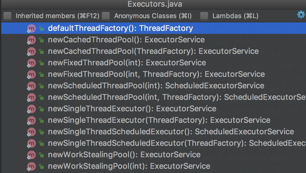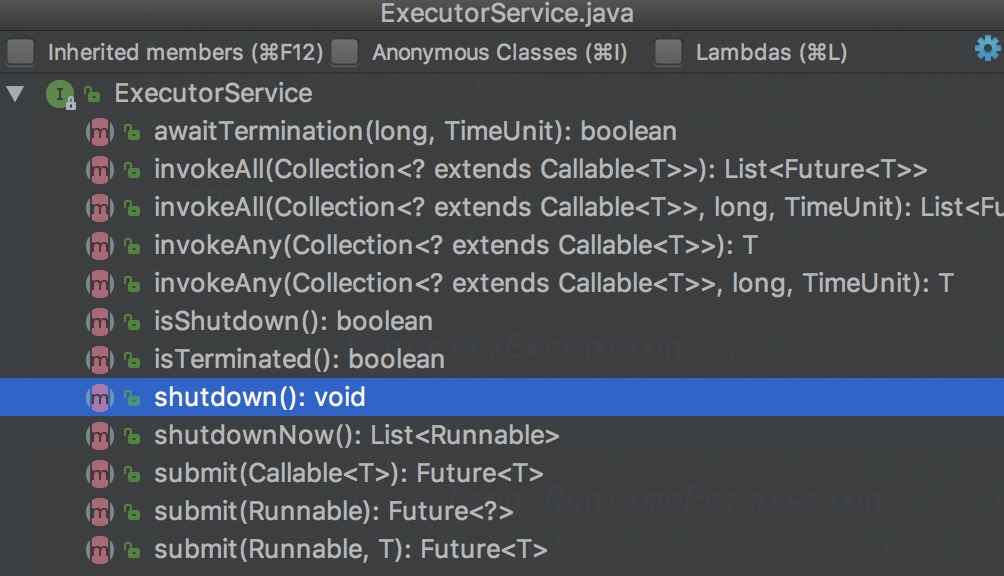 ExecutorService继承了Executor并且定义了其它一些方法,结果如下图: