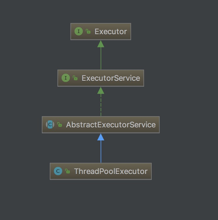 可以看出,实际上ThreadPoolExecutor是继承了AbstractExecutorService类和引用了ExecutorService、Executor接口。
