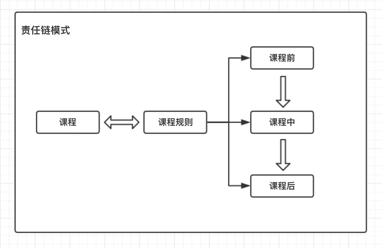 一节课堂,有课前、课中和课后,不同老师、不同地点或者不同时间,课堂的内容和实际都有所不同,如果在一个service中写业务逻辑,代码可读性会比较差,别人维护也麻烦,所以使用责任链模式,将每一步分开维护,大概流程如下: