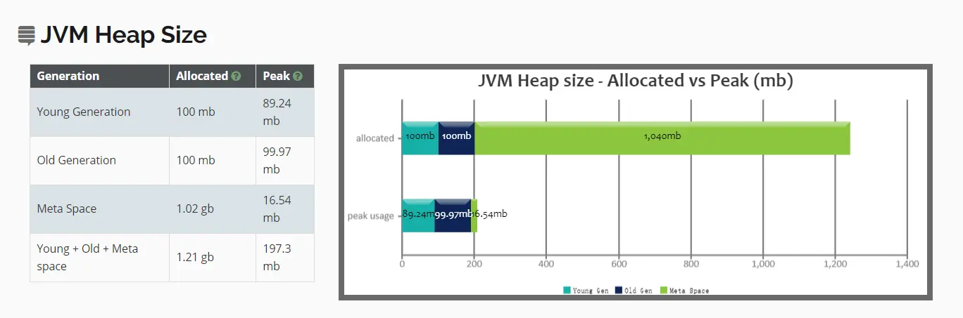 (1)统计年轻代、老年代、元数据区最大可用空间以及峰值,这里元数据区大小在我们的虚拟机参数没有配置,所以取的是默认值1040M