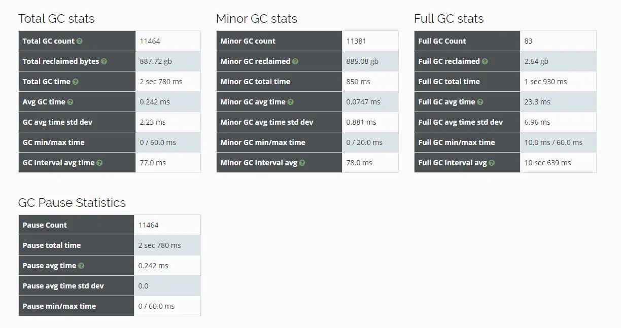GC日志分析可以帮助我们宏观的监控GC运行情况。一方面如果频繁的FullGC会有严重的性能问题(STW),另一方面过于频繁的GC,即GC占用系统正常运行的比重过多,吞吐量低,则是一定程度上的性能资源浪费。若系统存在性能问题,根据GC分析各项指标的作为参考,我们也可以适当的在程序里或虚拟机参数做些调优。