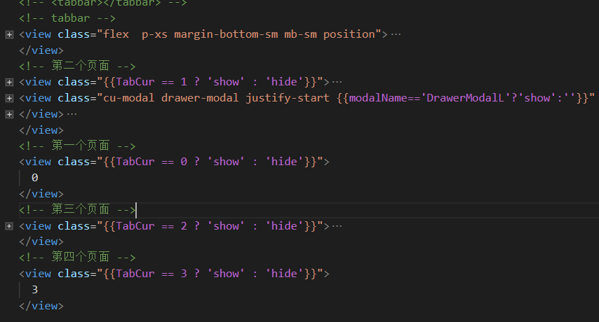 刚开始想直接用组件写那个最上面的tabbar,后面一想,等以后用习惯了岂不是这么简单的tabbar都写不出,所以能自己写就自己写。这是个菜鸟的基本素养。 我是用TabCur来判断当前页,从而添加一个show或hide类来控制该页面是显示还是隐藏。