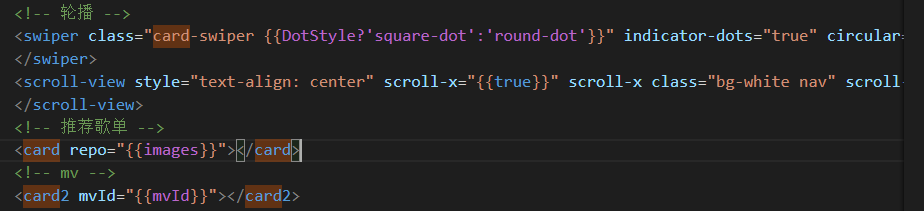 - 推荐歌单那一块是自己写了个组件叫card,在调用card组件的页面给card传了个images的数组取名为repo,这样card组件上就能用这个数组了