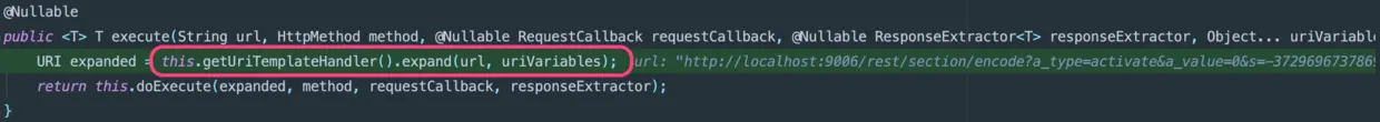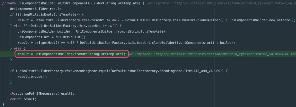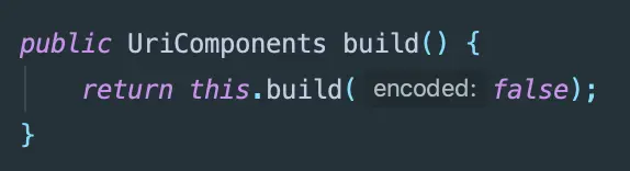 可以看到,build UriComponents,有个encoded参数,默认为false 先不透露具体细节,只需先记住构建这次请求的UriComponents,encoded参数为false!!!