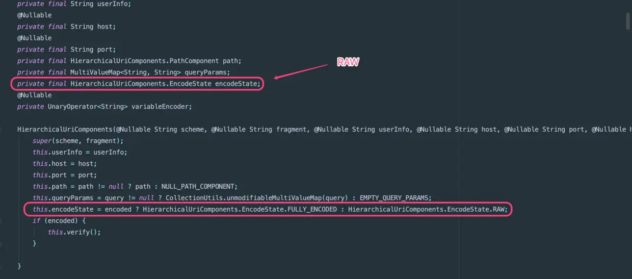 - 最后可以看到HierarchicalUriComponents.EncodeState为RAW