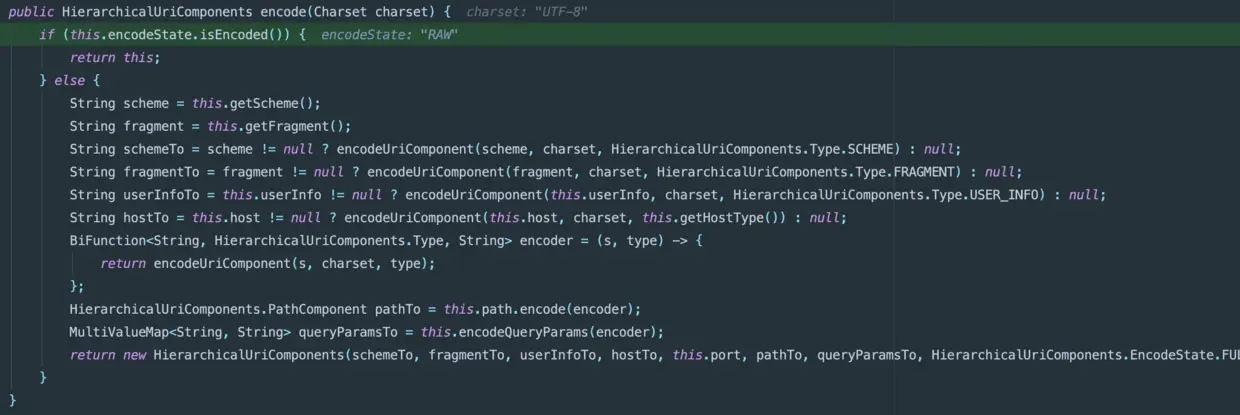 从上个提示重要的剖析点得知,构建UriComponents,encoded参数默认为false,进而从源码可得知,HierarchicalUriComponents.EncodeState的值为RAW。那么就会走下面的encodeUriComponent的方法(至于怎么encode暂不在分析范围内,看源码貌似是用字节流操作来encode,有兴趣可以阅读)