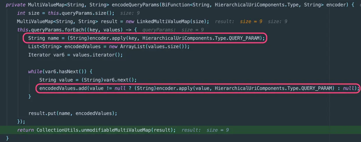接着看encoded参数为false,会影响到哪些参数值 由encodedfalse可得到UriComponentsBuilder.EncodingHint为NONE