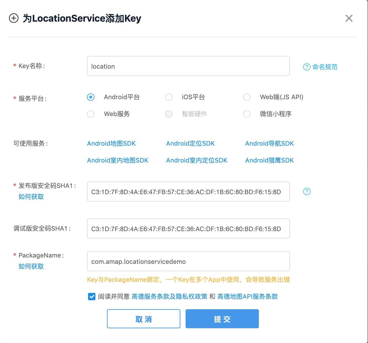 3.用以上的SHA1在高德官网上注册应用App,并且生成key