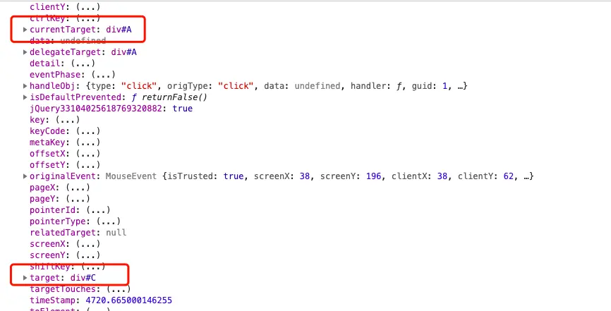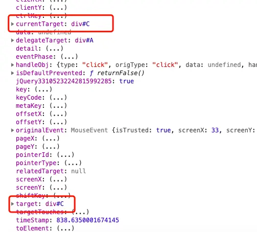 target 是触发 click 事件的对象 #C,currenttarget 是 #C,因为 #C 委托 #A 绑定 click 事件,并且 #A 自身没有绑定 click 事件