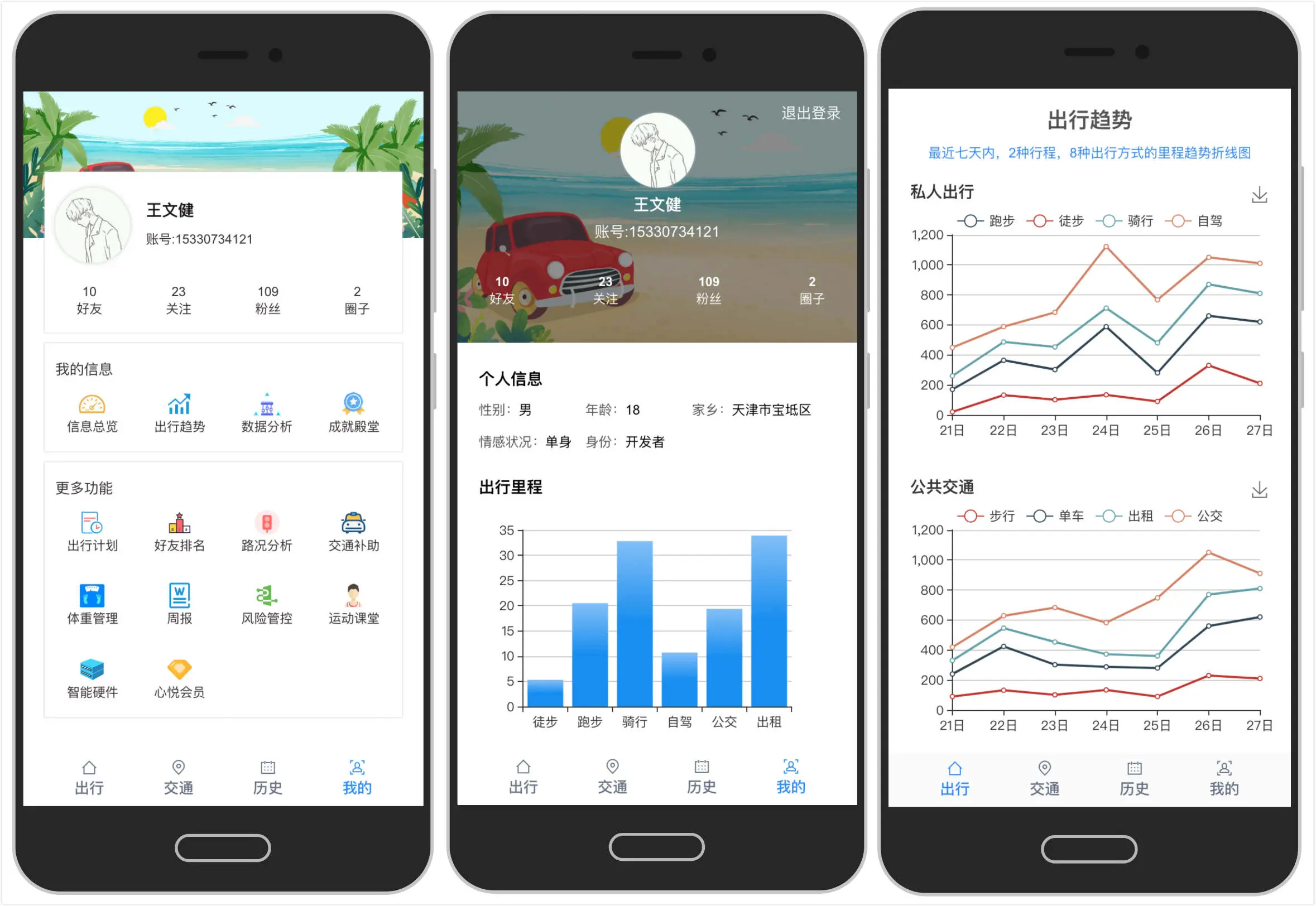 查看我的详情信息,通过出行数据分析得到的出行趋势折线图,与出行数据相关的数据分析图表,其他功能未写