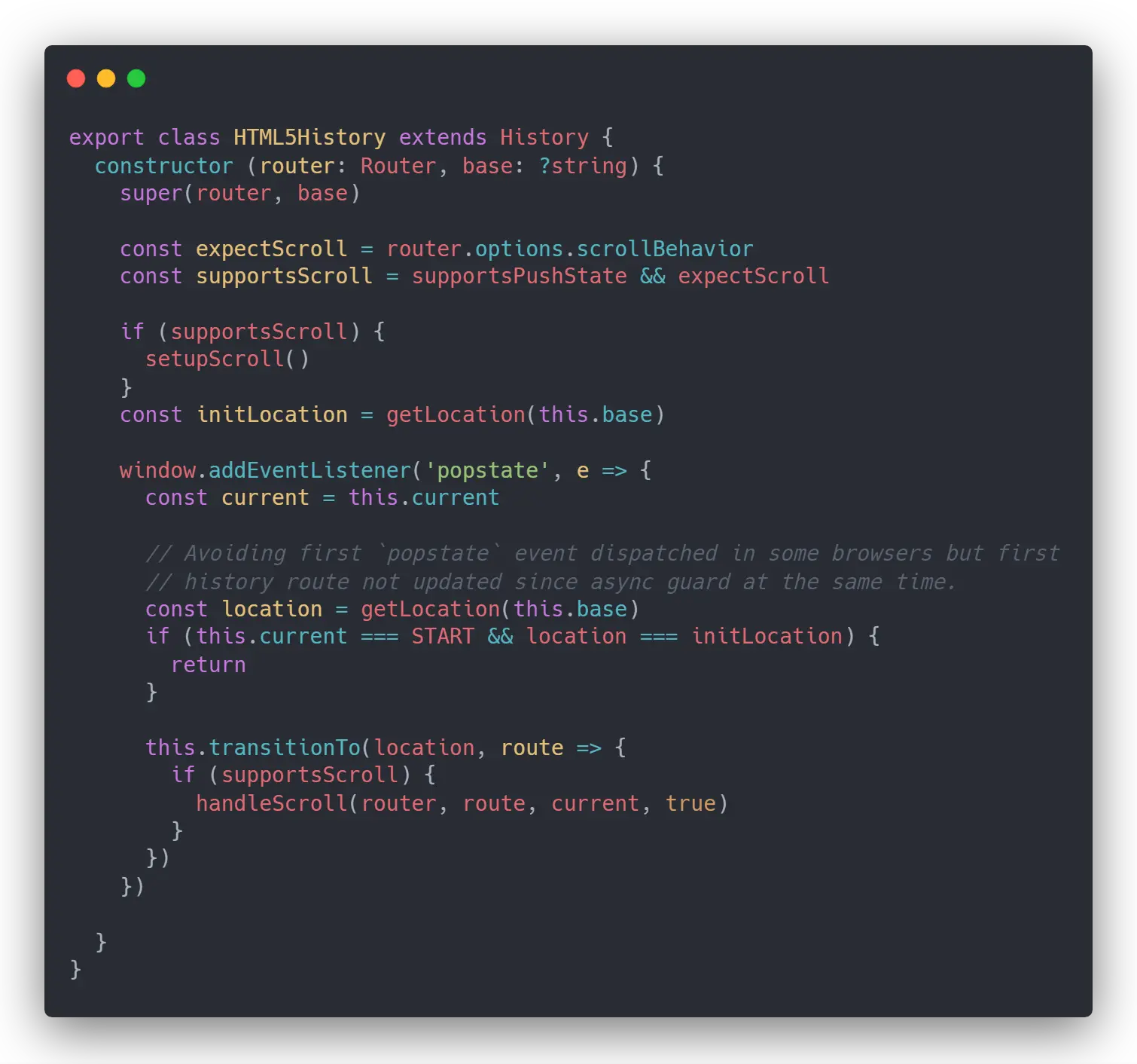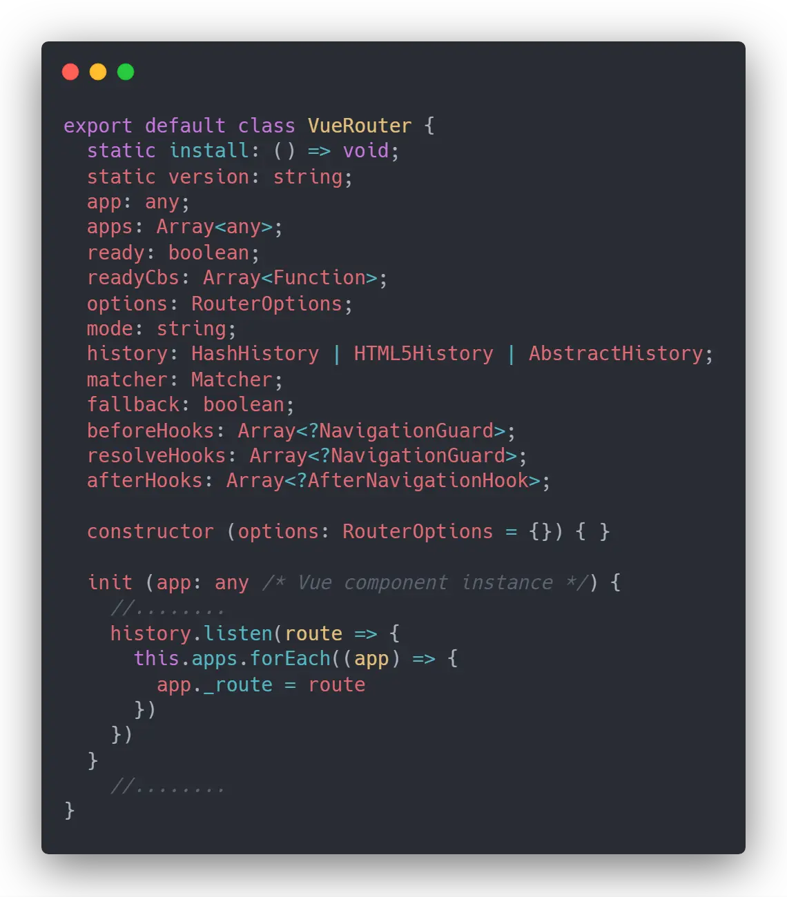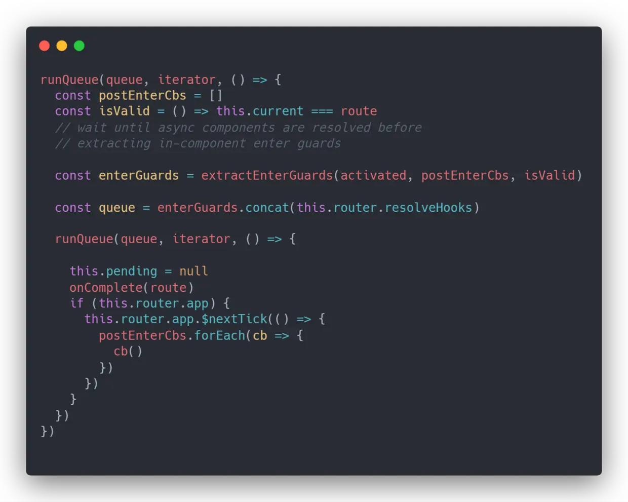 不仅如此,通过阅读源码能够对这个框架有着更深层的理解,而不是死记硬背框架某些的行为,就比如为什么 beforeRouteEnter 中必须要通过 next 方法的回调形式才能获得 Vue 实例,以及路由守卫是怎么根据文档中的执行顺序一步步执行的