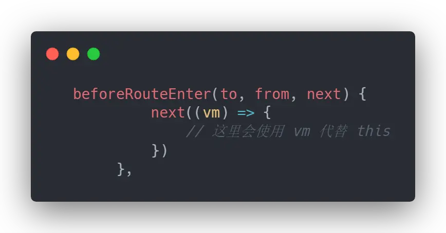 这是为什么呢?我们同时再来思考一个问题,为什么 vue-router 的其他守卫可以直接在内部通过 this 访问组件实例,而 beforeRouteEnter 必须通过在 next 函数中传入回调的形式来获取组件实例?这2个问题我们放到后面来讨论,继续往下走主线的流程