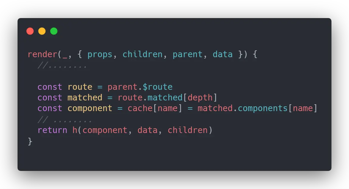 router-view 内部会通过 render 函数根据 $route 中的 components 属性也就是组件配置项,生成 vnode 最后交给 Vue 渲染出视图,所以就会依赖到 $route