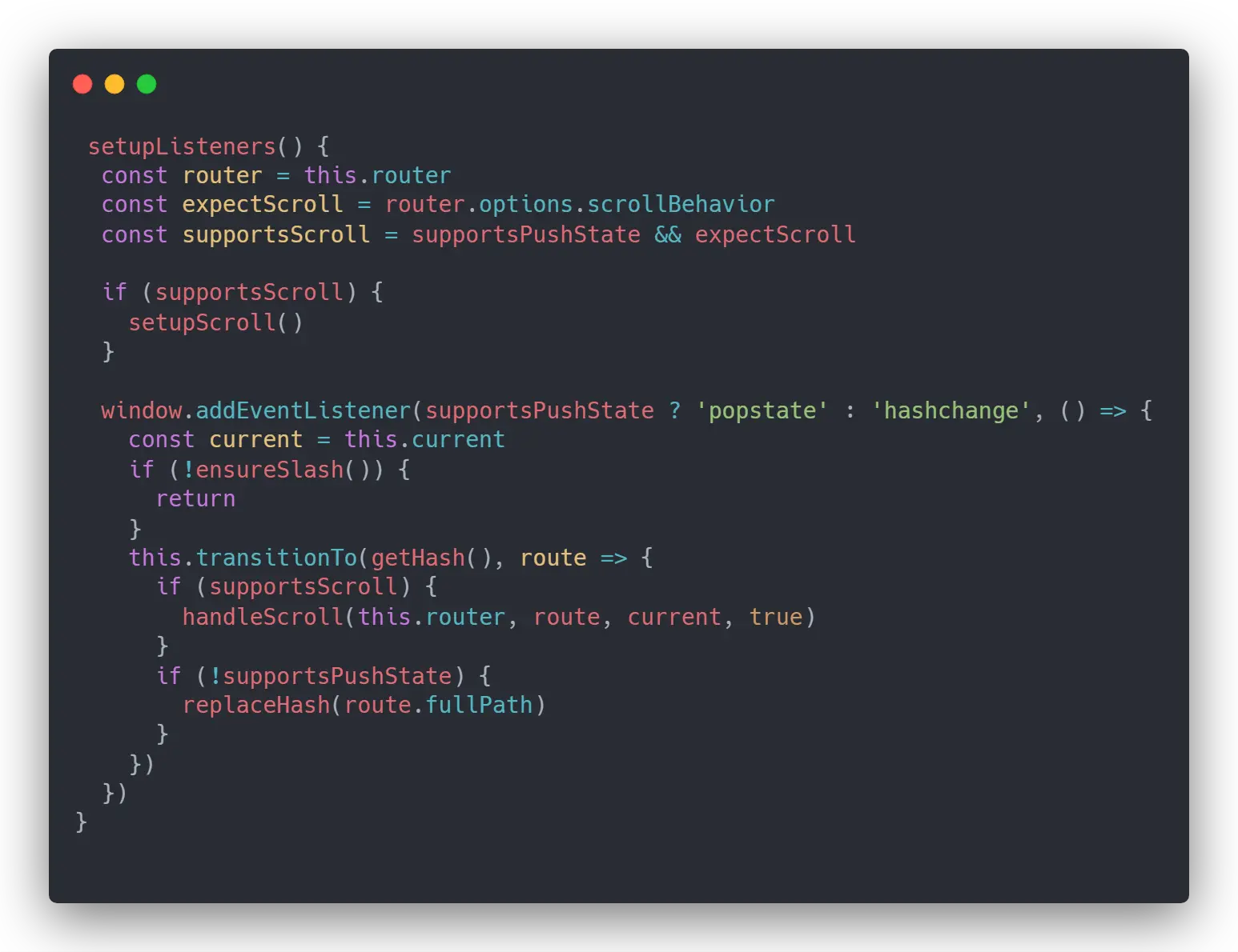 在 updateRoute 方法执行后会执行 transitionTo 方法的成功回调,hash 模式最终会执行 setupListeners 设置监听事件