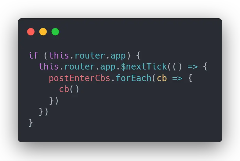前面介绍 beforeRouterEnter 时提到,vue-router 会将 next 方法中的回调推入 postEnterCbs 数组中,当 confirmTransition 的成功回调执行完毕后,会把 postEnterCbs 数组放到 nextTick 后执行
