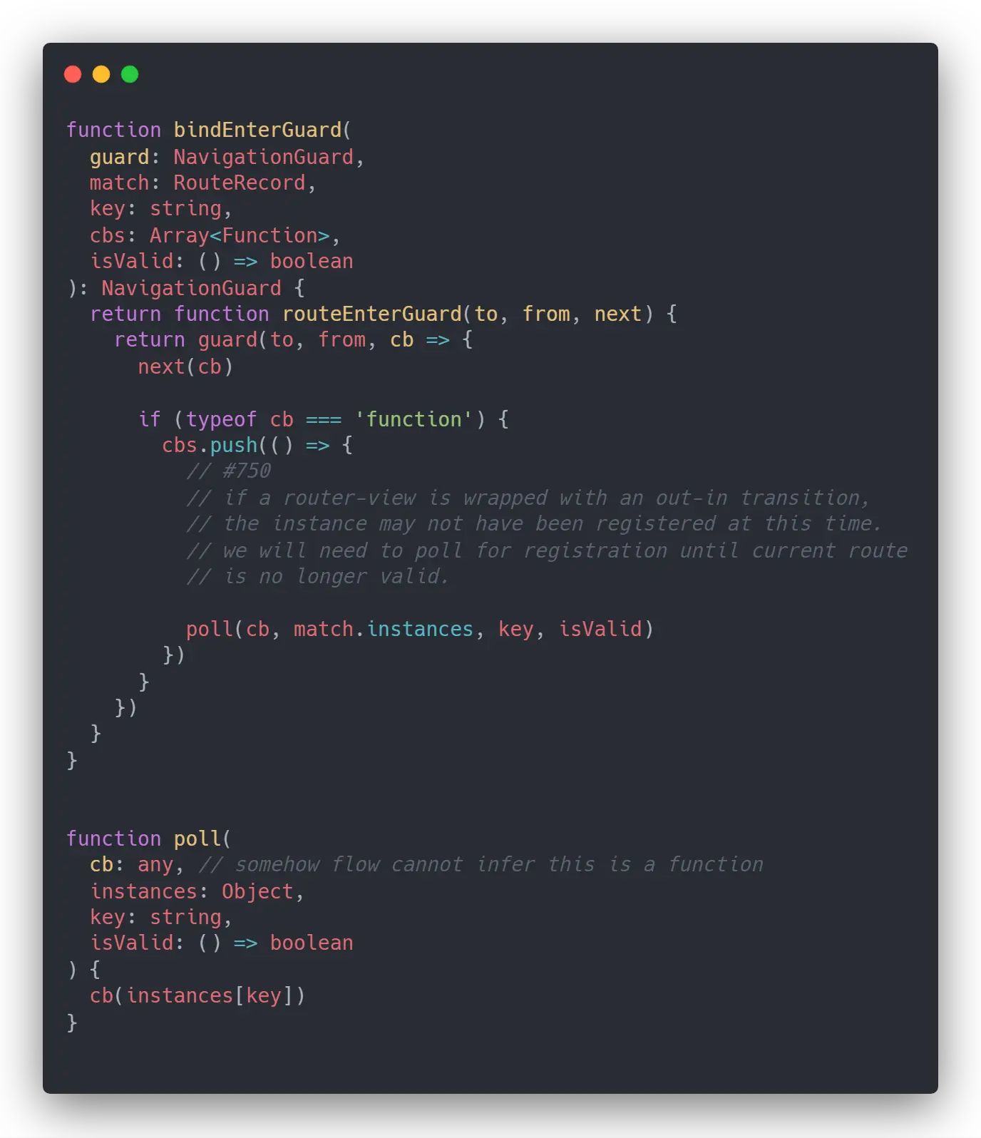 如果在组件中 beforeRouteEnter 守卫里的 next 函数里,传入了一个回调函数,就会往 postEnterCbs 数组中添加这个回调,同时回调会被包裹一层 poll 函数用来指定参数,即组件实例 vm