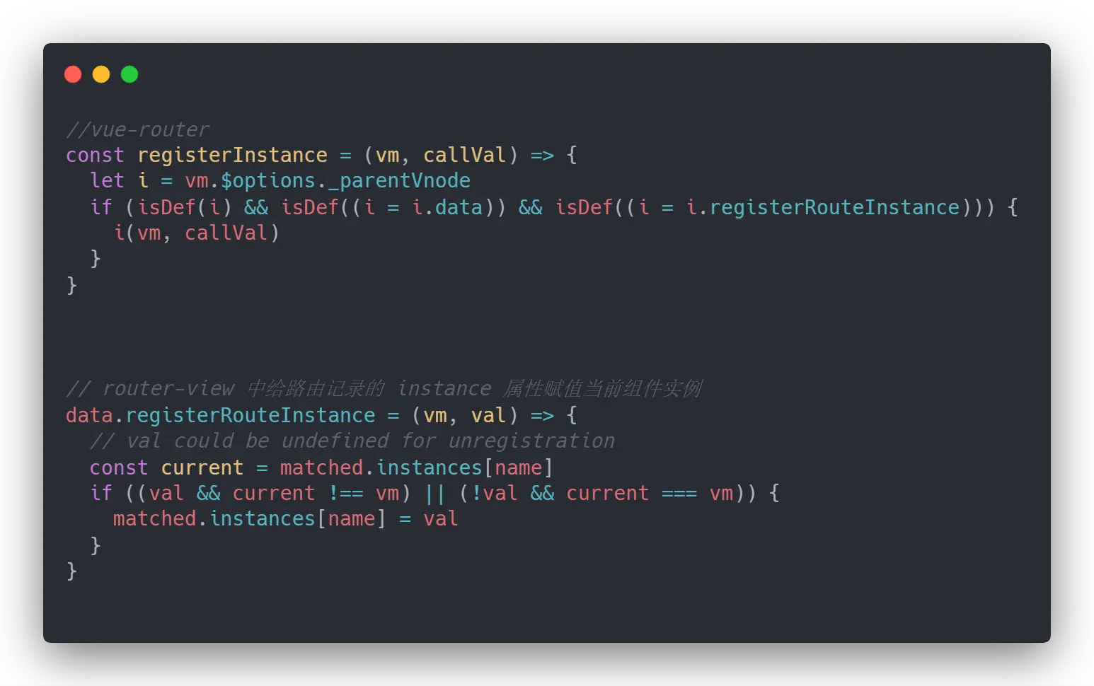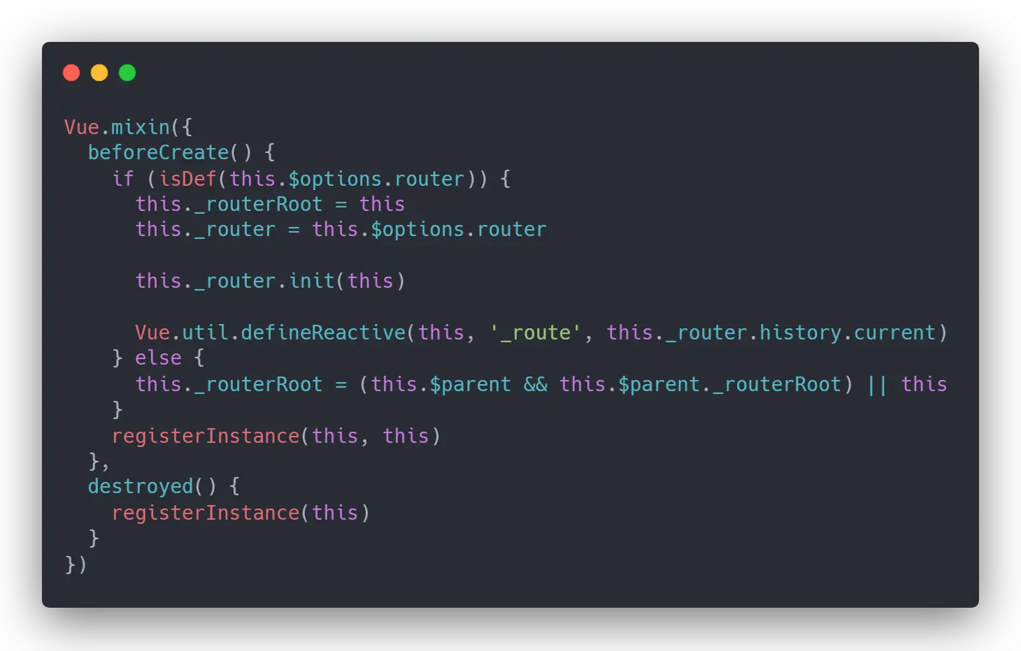 回到最初安装 vue-router 的时候,vue-router 会全局混入 beforeCreate 和 destroyed 2个钩子,之前我省略了 registerInstance 这个函数,完整的代码是这样的