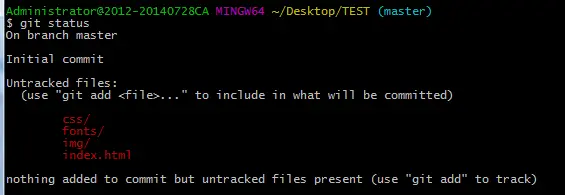 第三步:这时候你就可以把你的项目粘贴到这个本地Git仓库里面(粘贴后你可以通过git status来查看你当前的状态),然后通过git add把项目添加到仓库(或git add .把该目录下的所有文件添加到仓库,注意点是用空格隔开的)。在这个过程中你其实可以一直使用git status来查看你当前的状态。