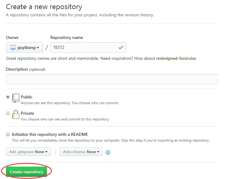 另外,这里有个坑需要注意一下,就是在上面第七步创建远程仓库的时候,如果你勾选了Initialize this repository with a README(就是创建仓库的时候自动给你创建一个README文件),那么到了第九步你将本地仓库内容推送到远程仓库的时候就会报一个failed to push some refs to https://github.com/guyibang/TEST2.git的错。 这是由于你新创建的那个仓库里面的README文件不在本地仓库目录中,这时我们可以通过以下命令先将内容合并以下: