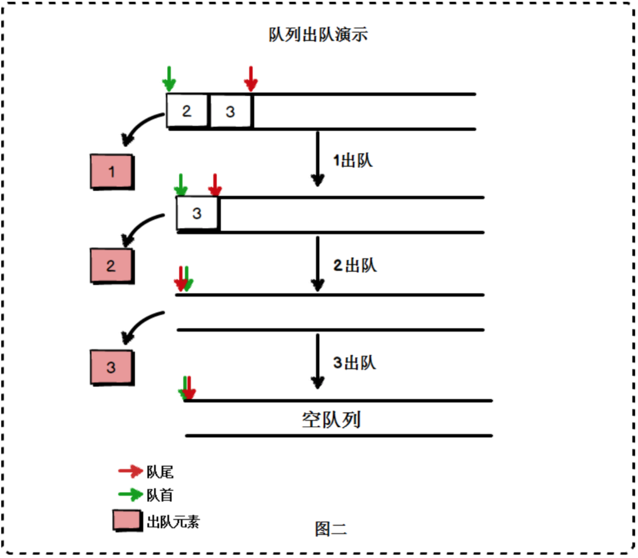 - dequeue 从队列头部删除一个元素(队伍最前面的人办理完事务,离开了队伍)