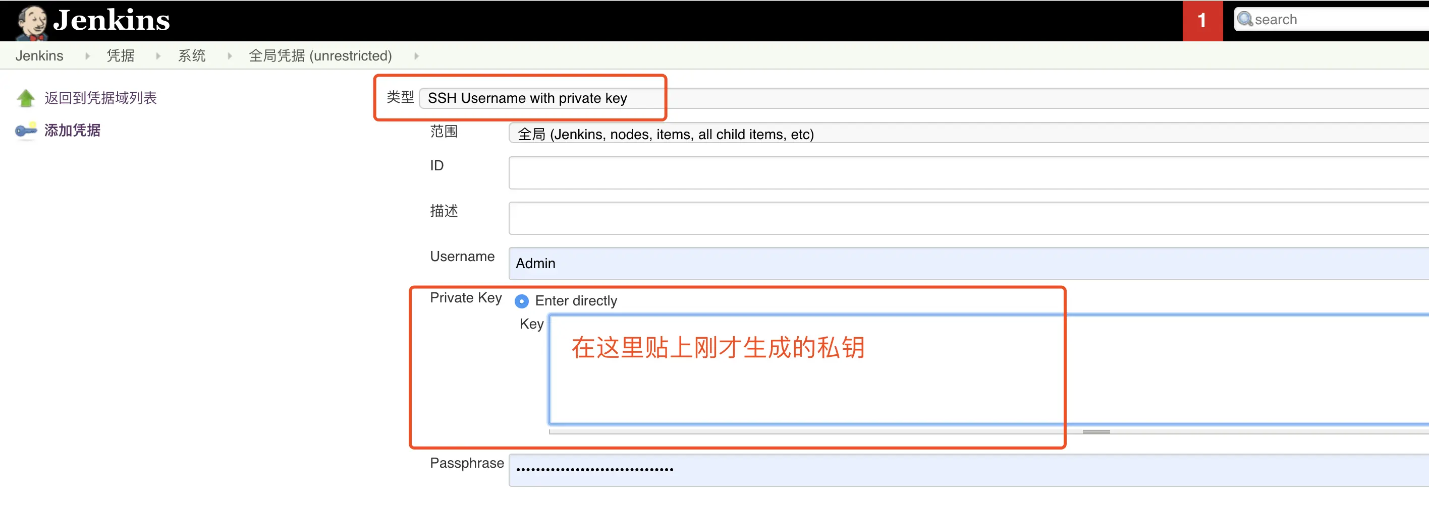 Jenkins凭据中,配置秘钥(注意,是秘钥,路径~/.ssh/id_rsa)