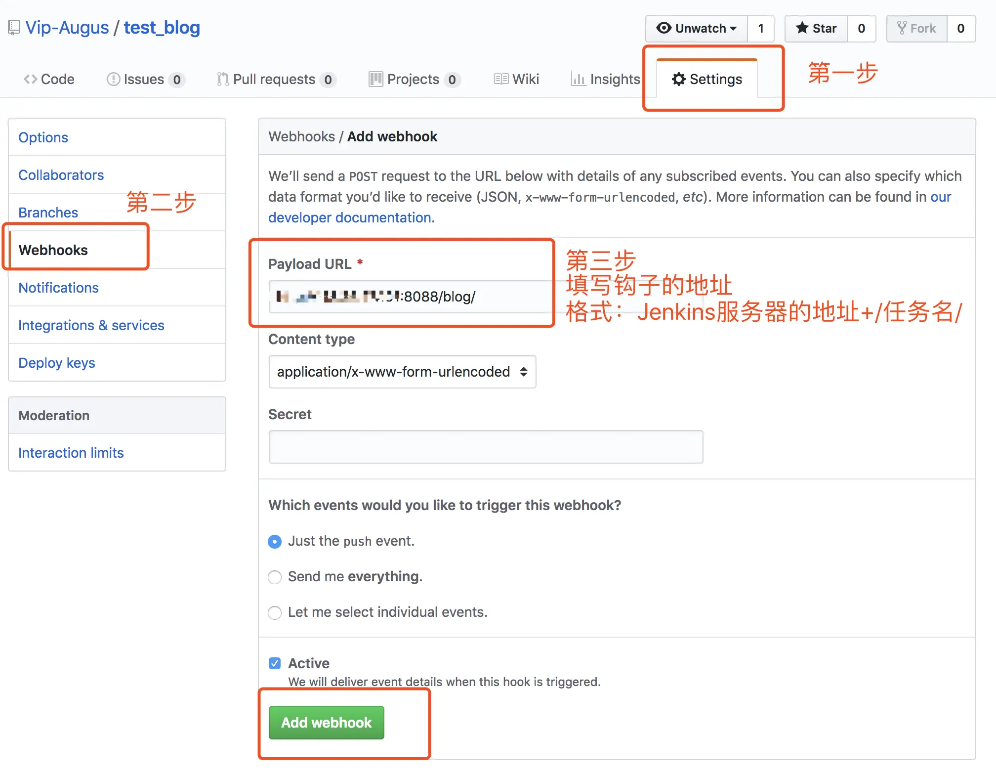 - 在项目中添加webhooks,路径:repo->settings->webhooks