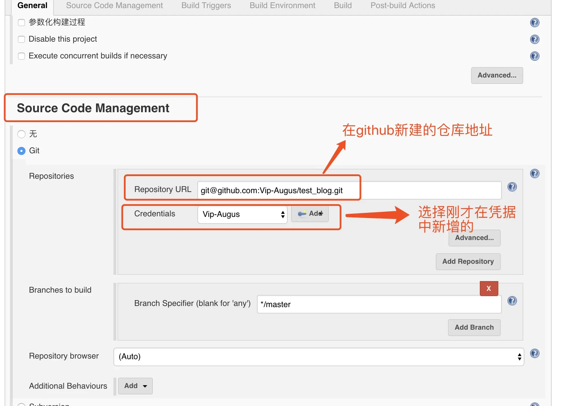 在原代码配置项中,选择git,将项目地址填上,还有选择上一步填写的凭据~