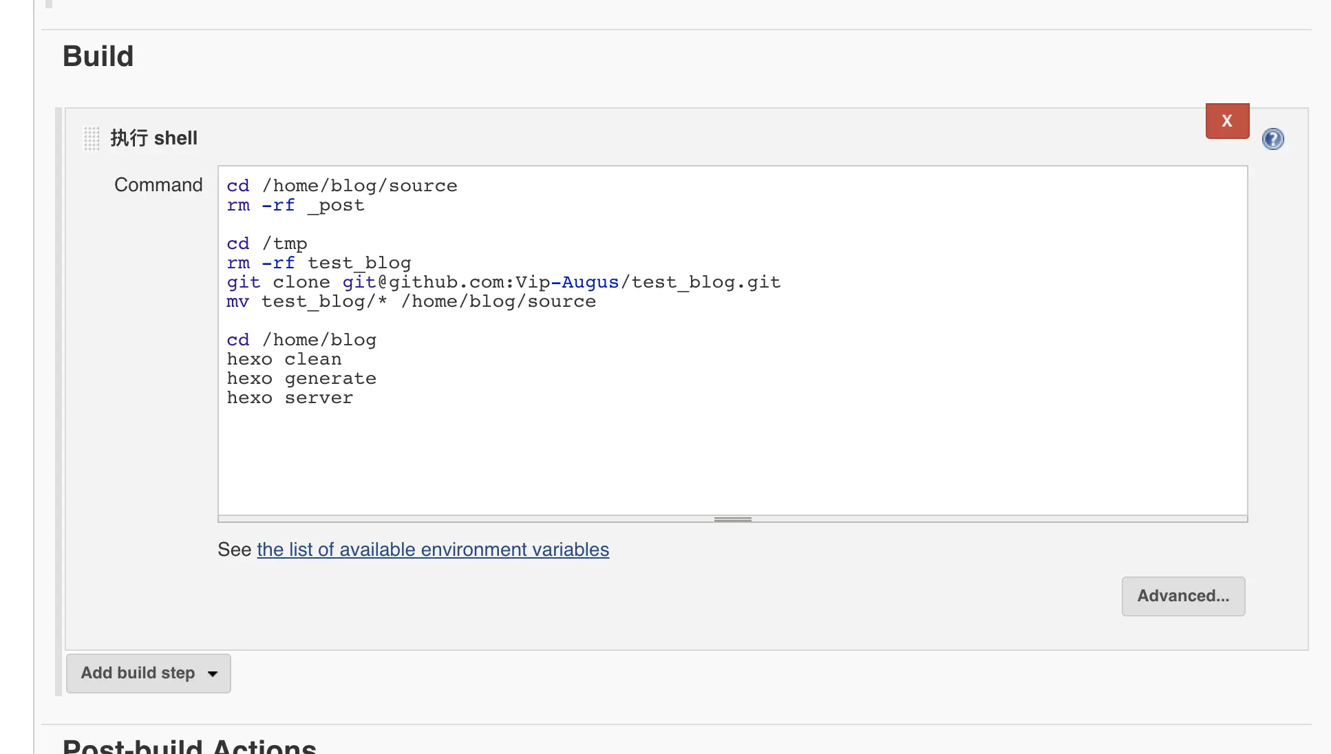 - 执行Shell脚本,在服务器中生成hexo静态文件