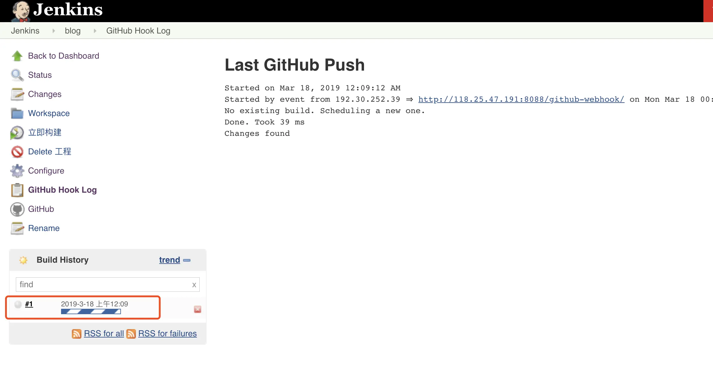 在本地编写文章后,推送到github,点击查看Jenkins的github hook输出记录,可以发现已经在构建了,只要你的shell脚本写的对,那就能直接观察到服务器上的博客内容成功更新~~
