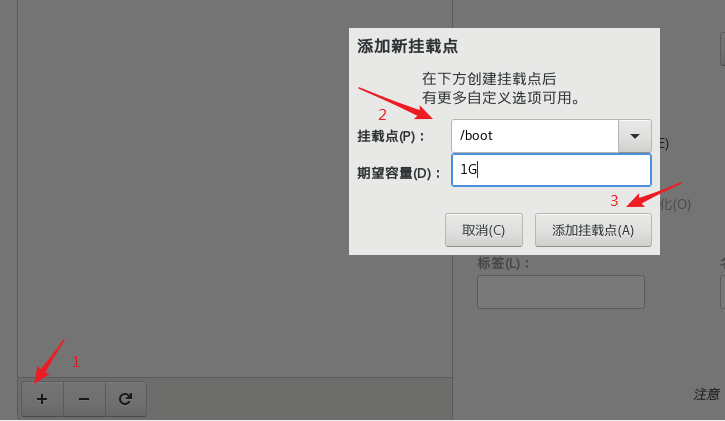 接着,新建 /boot 挂载点,容量为 1G。