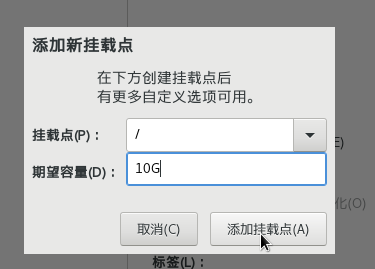 然后,新建根目录 『/』,容量为 10 G。