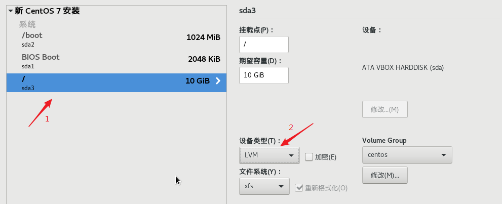 注意: 之后新建的挂载点( /, /home, swap) 都希望使用 LVM 设备类型,所以我们在『新增挂载点』之后,要回到详细设定页面,修改下设备类型。