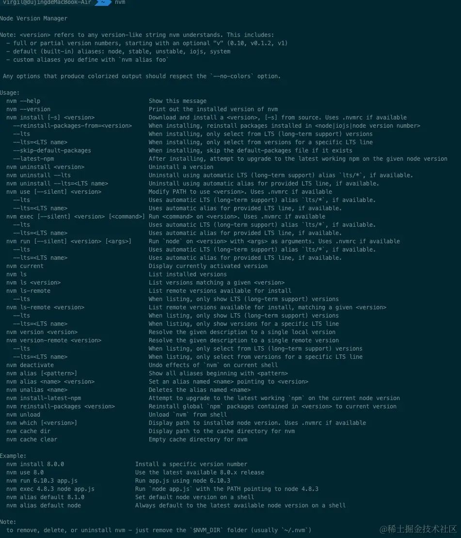 注:如果想要了解更多的 nvm 命令,只需要输入 nvm -help 命令,即可查看 nvm 全部命令;目前安装及使用主要针对 Mac 来操作的,至于其他操作系统,以后另加补充。