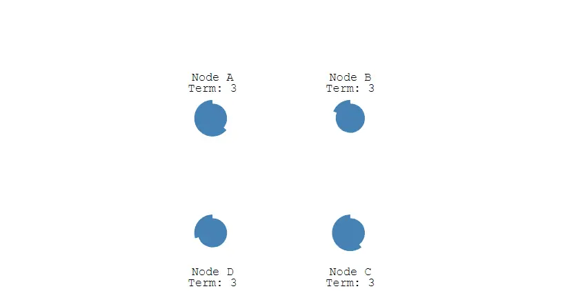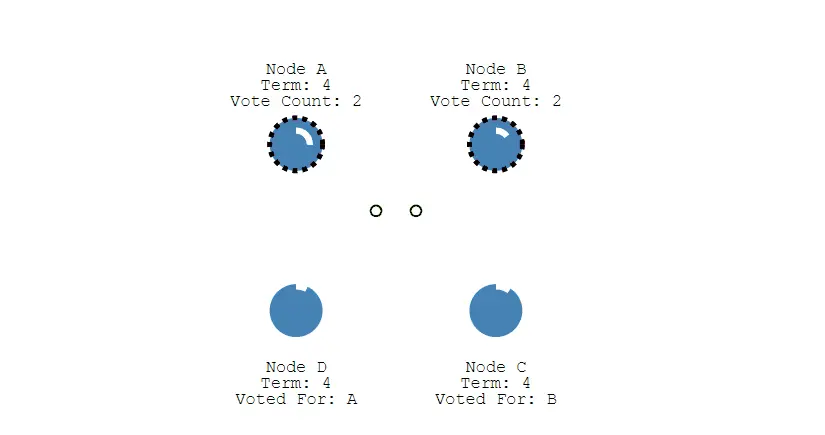 - 如果有多个 Follower 成为 Candidate,并且所获得票数相同,那么就需要重新开始投票,例如下图中 Candidate B 和 Candidate D 都获得两票,因此需要重新开始投票。