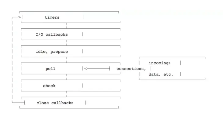 - 上边的每一个模块都是事件循环的一个阶段,每个阶段都有一个要执行的回调的FIFO队列。虽然每个阶段都不同,一般来说,当事件执行到一个阶段,先执行这个阶段特有的操作,然后操作这个阶段的队列,当队列执行完或者达到了回调上限,事件循环就会执行下一个阶段。