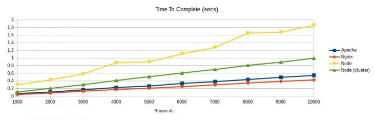 还有一个相当惊人的事实是,在特定的用户并发数和请求数下,Node.js 可以比 Nginx 和 Apache 更快。