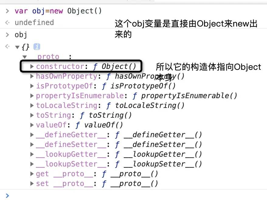 保存着用于创建当前的对象的函数,也就是对于之前的例子而言,所有用Object直接new出来的对象里面都有constructor,而这个constructor指向它的父亲,也就是它的制造者,也就是谁new出来的,也就是Object本身