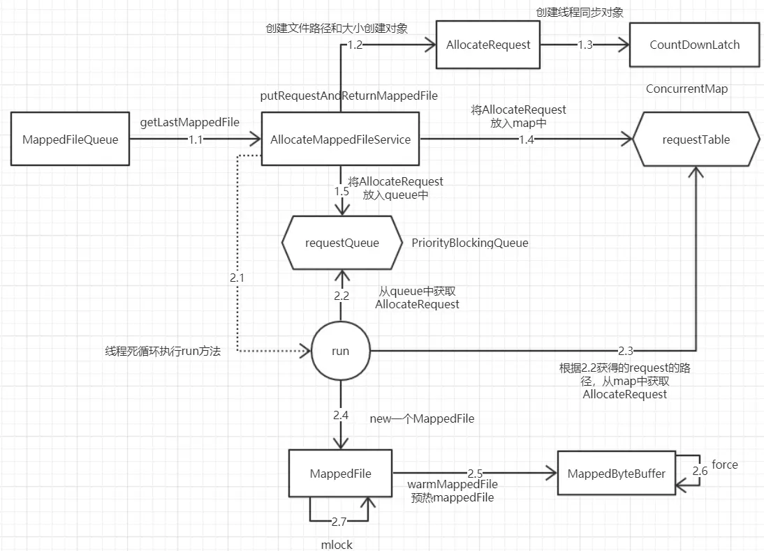 - AllocateMappedFileService线程持续监听队列,队列有请求时,创建出MappedFile对象