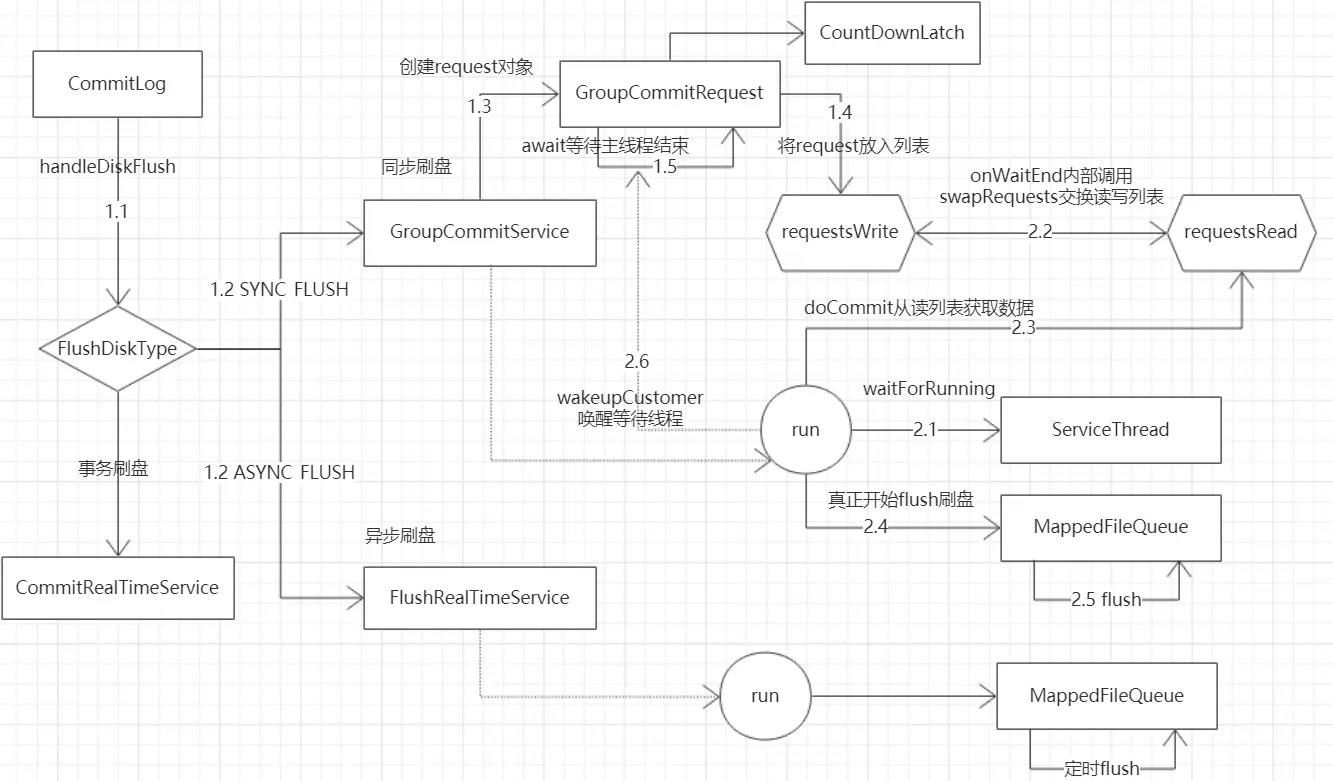 - 同步刷盘也是生产者-消费者模型。broker保存消息到MappedFile后,创建GroupCommitRequest请求放入列表,并阻塞等待。后台线程从列表中获取请求并刷新磁盘,成功刷盘后通知等待线程。