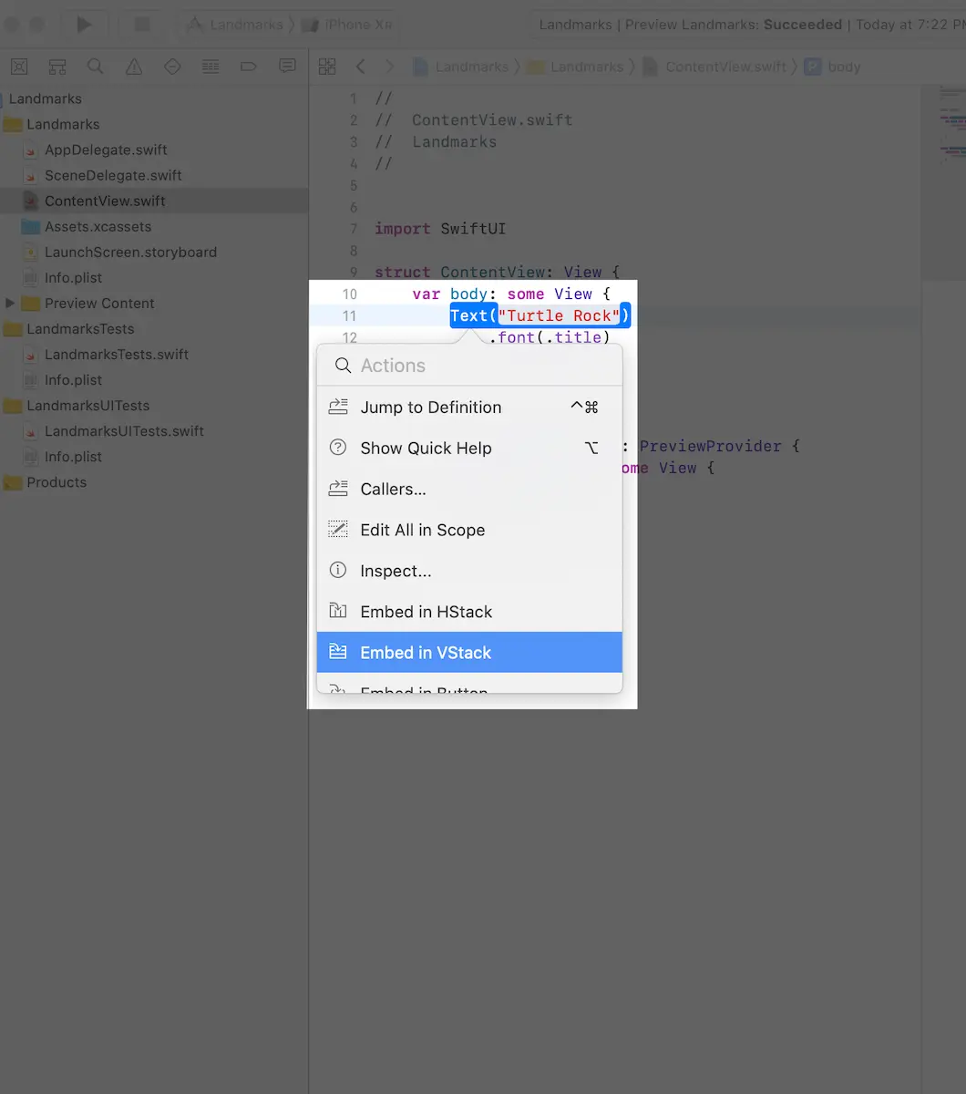 按住Commond键并单击Text("Turtle Rock")代码行,选择Embed in VStack。