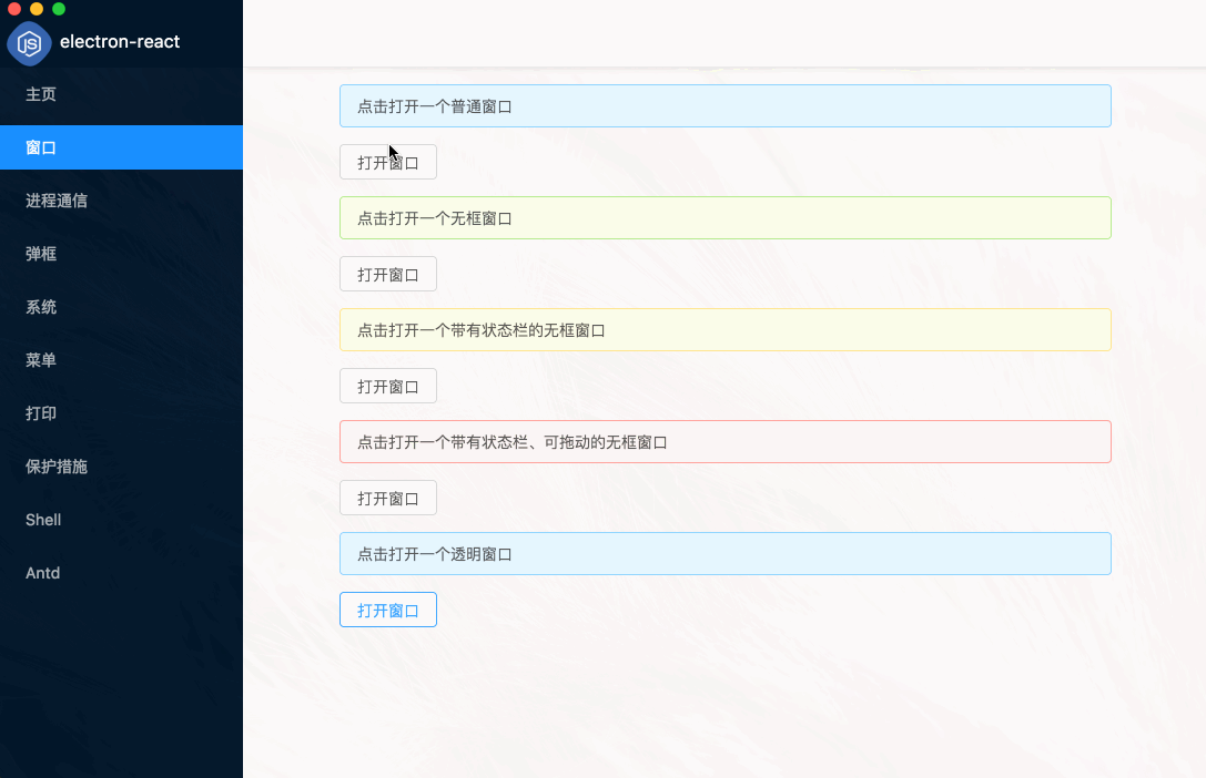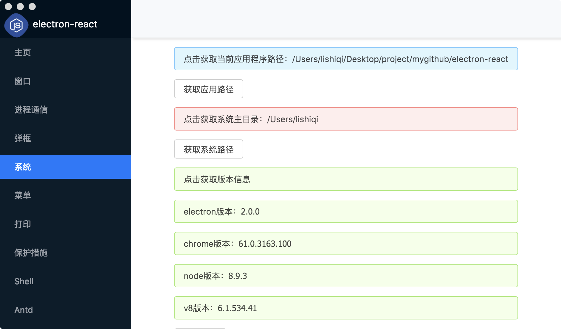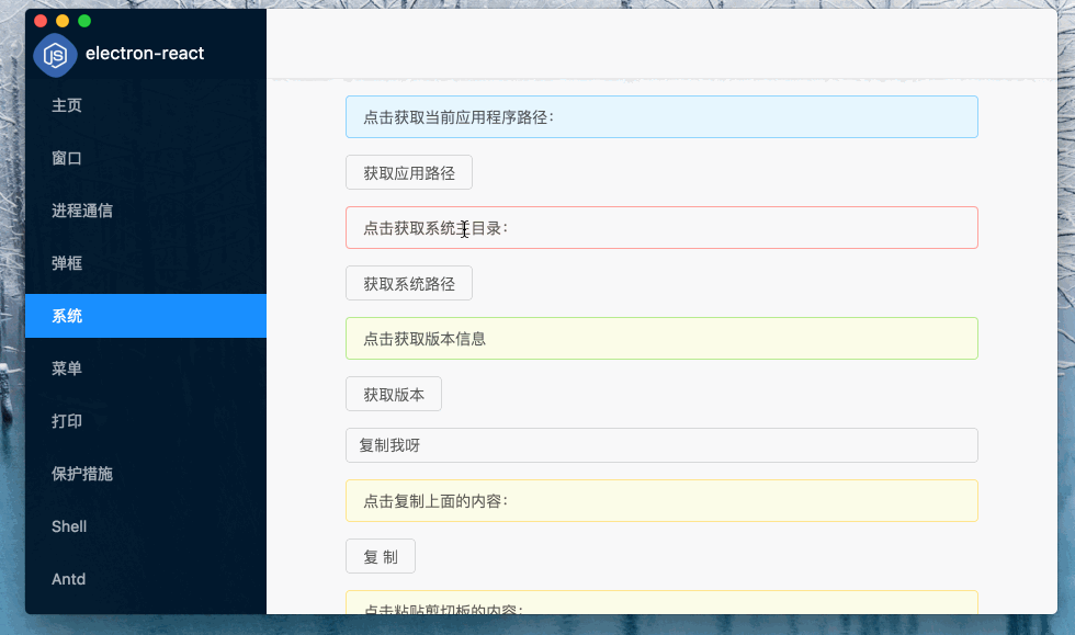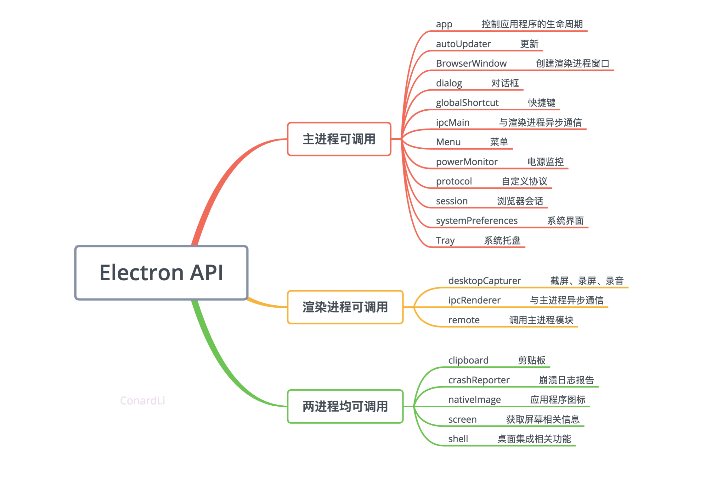 Node.js APIElectron提供的主进程API(包括一些系统功能和Electron附加功能)
