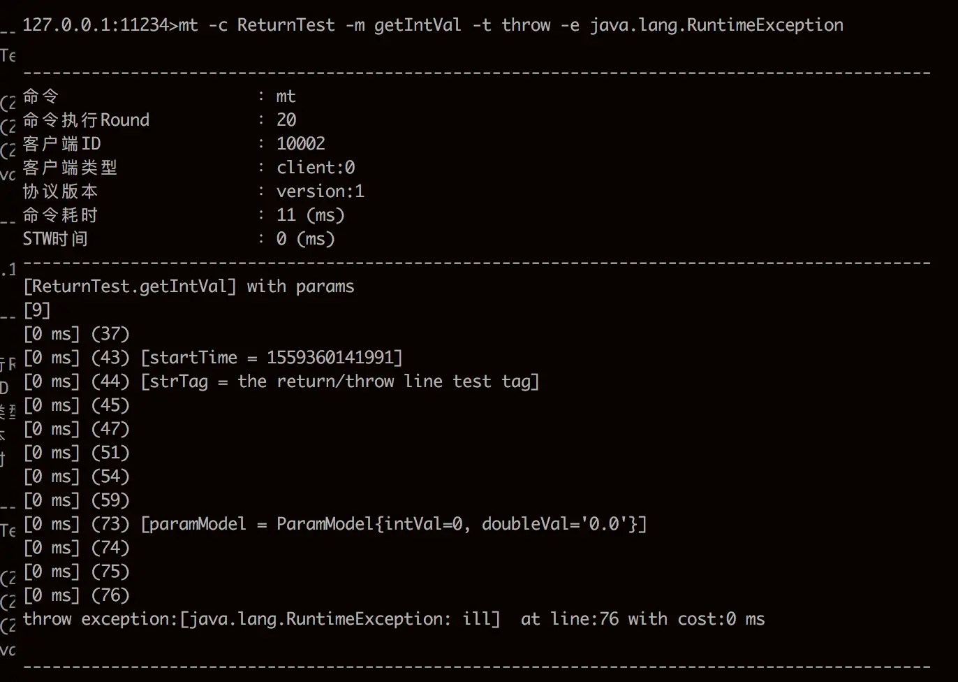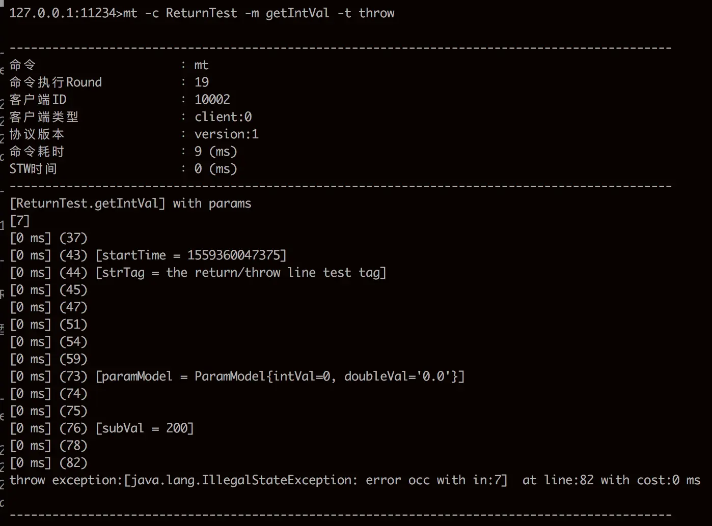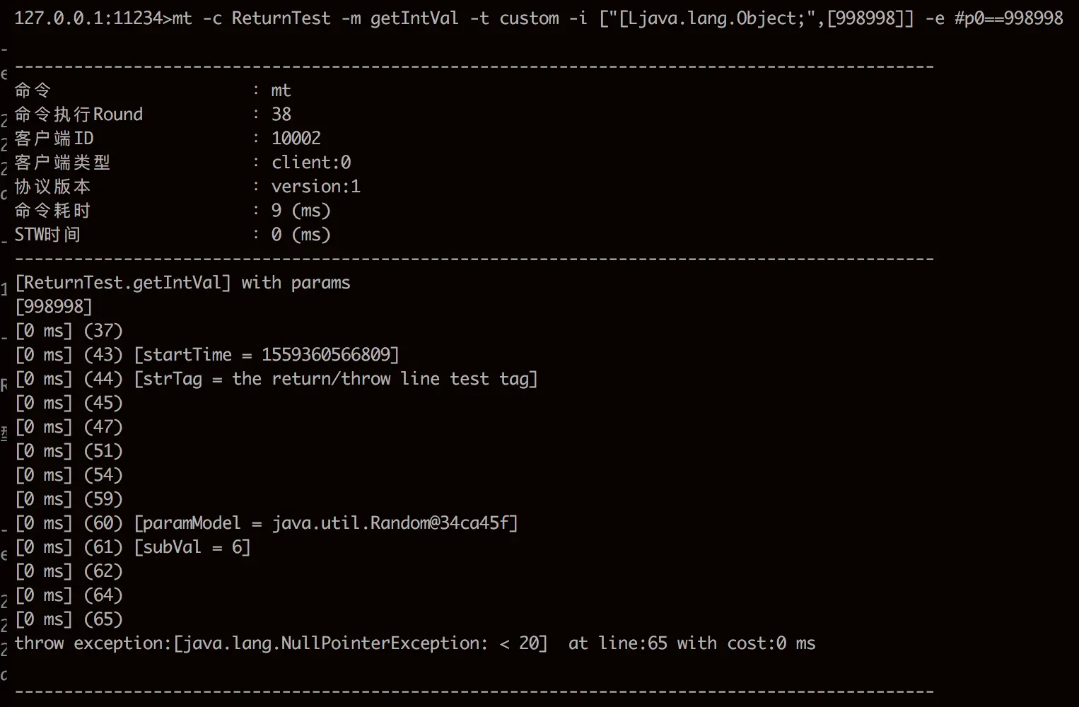 接着就是具体方法的执行路径信息,比如上面这个例子,说明本次观察的方法执行是 "ReturnTest.getIntVal",方法入参是1,方法执行路径是37-43-44-45-47-51-52-53,最终从53行退出,其中第52行耗时3ms,其他行耗时小于1ms,所以无法收集到,最终方法的执行结果是101,本次方法耗时5ms,并且可以看到43、44、52行都有变量赋值信息,格式为 varName = varVal.toString(),需要注意的是,varName可能是错误的,但是varVal是正确的,如果有多个,按照赋值顺序展示;这是方法正常返回的结果展示,下面看一个方法抛出异常的结果展示: