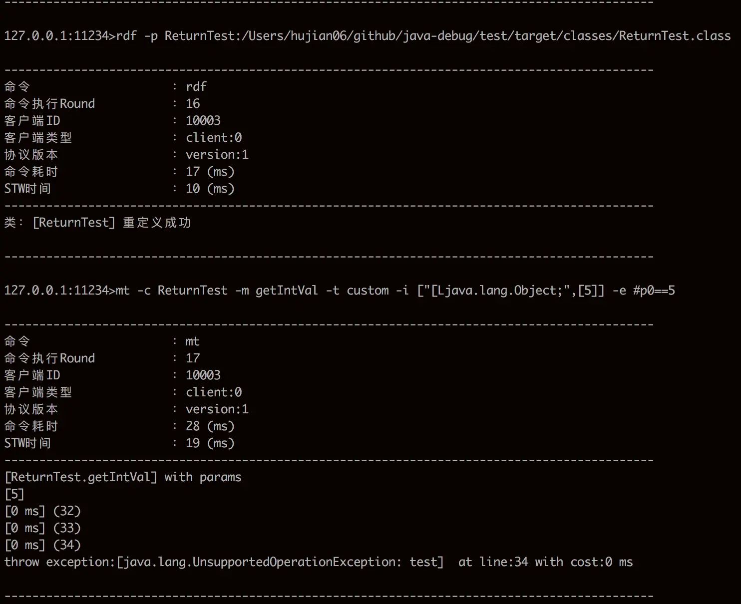 - (4)自定义输入参数进行方法调用,并进行方法执行路径观察:需要注意的是,在执行自定义参数调用之前,Java-debug-tool需要获取到目标对象,或者目标方法是一个静态方法,否则Java-debug-tool命令会一直等待获取目标对象(不会主动创建目标对象)