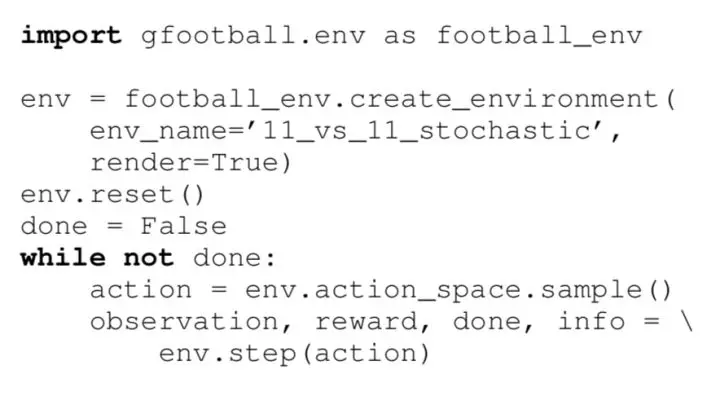 整个环境包含一场球赛中的各种环节,和正常的人类足球赛一样,两支队伍各11名运动员,一个智能体可以控制一个球员,也可以控制一整只队伍,双方遵循正常的足球规则进行比赛。