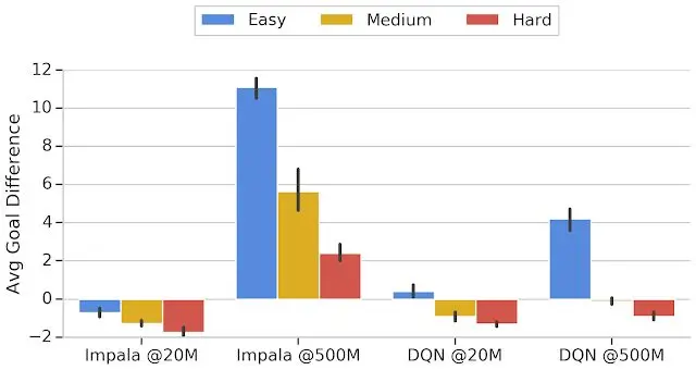 谷歌用DQN和Impala两个强化学习算法在模拟环境中测试,将它们的奖励均设定为进球得分,在高中低三个难度上得到了运行结果。